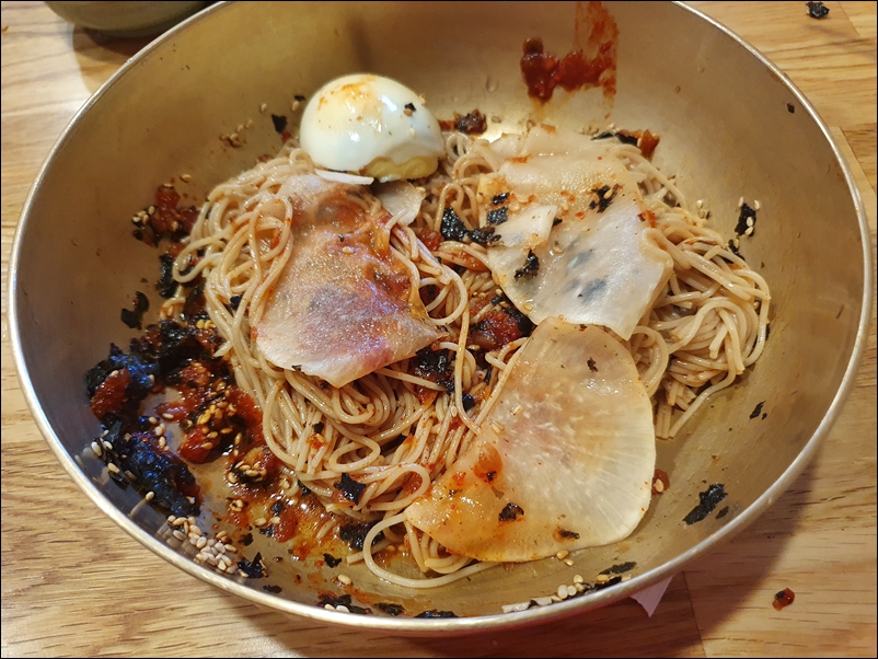 막국수다. 사진으로는 양이 작은 듯 보이지만 실제로는 많다.