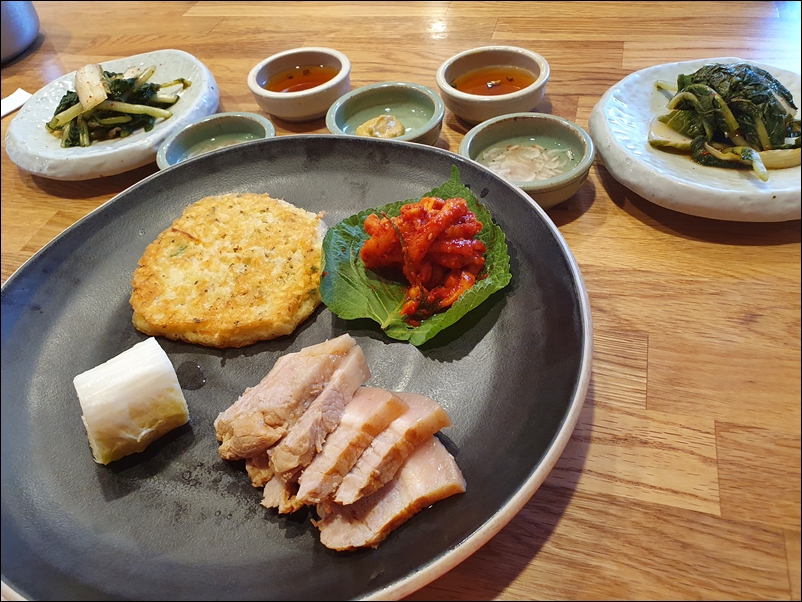 밑반찬들이다. 수육이 나오니까 새우젓이 있고 간장은 빈대떡 찍어 먹는 것.
